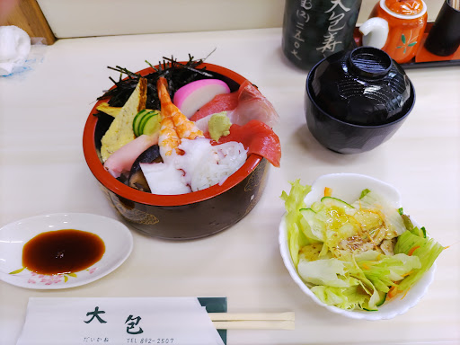 2022年9月 お昼に伺いました。明るくて、とも清々しい気持ちの良いお店です。日立市に住んでいた頃行っていたお寿司屋さんを思い出しました。 「生ちらし」1,100円を注文しました。下準備が良いのか数分で出てきたのにはビックリ。さすがお寿司屋さんのちらし寿司で美味しく頂けました。味噌汁・サラダ付き。特にマグロの赤身が美味しかった。シャリは粘度少し高めで好みは分かれるところです。食後にアイスコーヒー(ちょっと甘い)が付きます。 稲敷市のキャッシュレスキャンペーン対象店舗ですが、QRコードがまだ届いていないとのことで決済できなかったのはご愛嬌。後日今回分も対応してくれるそうです。 ちなみにお店の名前ですが「大包」と書いて「だいかね」と読むそうです。