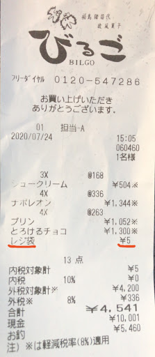 元々びるごの洋菓子がとても美味しく長年のファンで、遠方に越してからも近くに行く用事があれば必ず足を運ぶようにしていました。 コロナ禍でなかなか行く機会がありませんでしたが、いざ行ってみると店内は3密状態でお客さんが長蛇の列を作っています。お客さんとの距離は約30cm、消毒液は中身が入っておらず、レジ袋は不要と伝えたにも関わらず他のお客さんにも一律レジ袋5円を請求しているようでした。 (憶測ですがお客さん全員に5円請求かと)