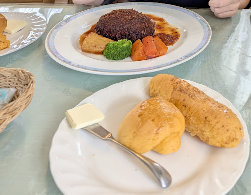 昔からあるケーキ屋さんです。その奥にレストランがあります。窓からは磐梯山が綺麗に見えて癒されます。 店内はグリーンで統一されて清潔感があります。窓辺にはランプなどが飾られていました。11時開店でお客様でいっぱいになり、平日なのに驚きました。人気なのですねー。 待ち時間にケーキのショーケースを覗きにいきましたが、なんと∑!!(@_@;)ケーキが安い。ちょっと詳しく忘れましたがオール350円では!?という位の安さ。しかし一切手抜きされていません。手間暇かかっているのがよく分かる見た目も良し!の素晴らしさ。 食事は以前から食べて見たかったメンチカツ。運ばれてきたお皿にはアツアツの黒いメンチカツ。揚げすぎ!?と思わせるカリカリ度。しかし、皆様ここでクレームを入れてはいけません。食べたら分かるこれぞ秘技。 表面のカリカリにナイフを入刀すると溢れ出るアツアツ肉汁とチーズの激流。思わずくわぁーと声が出ます(笑)ナイフで小さく小分けにしても一切崩れません。中がジューシーなのにです。それも最後まで、カリカリ、トロトロ、ジュワで、口のなかでとろけます。飲めるメンチカツ!それが、豚肉とは素晴らしい。 あの黒さは伊達じゃない。計算された揚げ加減なのでしょう。周りのトマトソースも手加減なくベストマッチされています。半分別腹並にお腹に入ります。お腹空いてなくても食べれてしまう感じです。 最初に出てきたサラダは非常にシンプルですが、2種類のドレッシングが味わい深い。美味しかったです。お水も美味しくておかわりしてしまった。 ただ、店員さんが性格なのか雑なのか、お皿を置く時、お水をつぐ時、コーヒーを持って来る時など、ちょっと気になる。お水をついだら周りに水がこぼれます。お皿を下げる時もドキドキします。いきなり感が( ̄▽ ̄;) ま、お気になさらずに食事を楽しみましょう。驚いたのは他の方ほぼ全員ドリア?グラタン?だったのです。チーズも美味しかったから推しなのかもしれま...