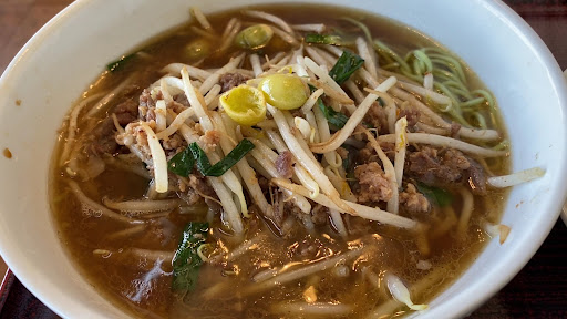 ラーメンから食べようと見ると麺が緑色です。 一口食べると麺からなんとも言えない独特の香りがし、普通の麺とは異なります。 だがラーメンのスープの味で麺の風味は良く分かりませんでした。 ぶっちゃけ二口目からは普通の麺との違いは分かりません。 担々麺のような肉そぼろともやし、ニラを炒めた具材とスープがおいしいです。 いっしょに出てくる辛味噌を好みで入れると汁ありピリ辛担々麺になります。 焼き飯も普通においしいのですが、揚げた銀杏がアクセントで更にうまかったです。