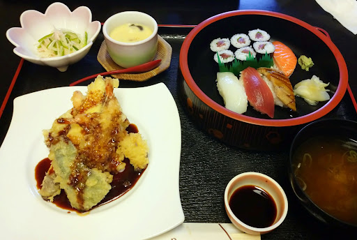 もう20年も前か⁉️ 一度ここにランチに来たことがある。 寿司か何かを食べたが、巻き寿司の海苔が美味くなくて‥。最近の評価の高さで数回来たが、臨時休業だったり駐車場が止められずあきらめていた店。 昼に立ち寄ってみました。 駐車場は店の北西に入ったところに8台位、第2はそこから西に行くとかなり台数止められる砂利の駐車場があります。 店内は結構大きく、平日ランチメニューは日替わりランチと茶碗蒸しで税込700円からと格安。 気になっていた御寿司日替わりセットは日替わりランチと御寿司ランチを組み合わせたメニューらしく、夫婦で「御寿司日替わりセット」(税込1,100円)を注文してみました。 どれくらいの物が出てくるのかわかりませんが、牛ステーキ膳(税込900円)、うな重(税込1,320円)、「ひつまぶしランチ」(税込1,980円)等値段を見てビックリですが、次回のお楽しみにします(笑)。 15分程かかり配膳されました。 今日の日替わりは天丼らしく、御寿司のおかずは天丼の上部部分(ヘッド)がそのまま盛られている。 タレもそのままかかっていました。 海老天2本にかぼちゃ、茄子、ニンジン、ピーマンの天ぷらと結構豪華(笑)。 寿司も大葉鉄火で香りがいい。 寿司にはわさびが入っておらず桶に別にそえられていました。 やはり前に感じたように巻き寿司の海苔が‥。 寿司は味的にもかなり普通でしたね。 ランチメニューは本当に安い。 ここの評価の高さはCP...