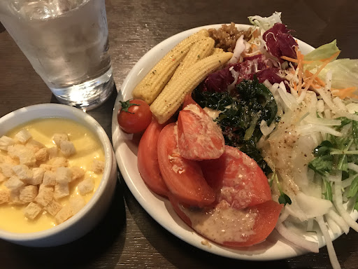 サラダバーの問題として、スープやカレーやご飯の位置はすぐ分かるけど、初見にはスプーンの位置が分かりにくかった 更に初見でもよく分かるサラダバー(デザートも含む)コーナーの隣に、サラダバーの内なのかよく分からないドリンクコーナーがあり、その隣にやはりサラダバー内なのかよく分からないアイスクリームコーナーがあった そして無料の水はそのアイスクリームコーナーとドリンクバーの間のスペースに茶色の半透明の何も書かれていないボトルで置かれていて分かりにくかった 有料のドリンクバーと、無料のお水その他は分かりやすく表示して欲しいです