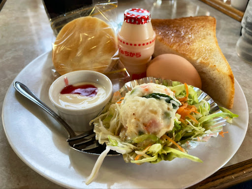 土曜の朝七時過ぎに夫とうかがうと、店内ほぼ満席でした。 感じの良いスタッフさんがお水と注文を取りに来てくださり、ホットコーヒーとアイスレモンティーを注文。 すぐにモーニングサービスとともに届きました。 モーニングの内容は、トーストは四枚切くらいのものが半分、乳飲料、バナナ半分、ヨーグルト、サラダ、ゆで卵と、盛り沢山でした。 料金は二人で860円。 地元の高齢層が多めのお店でしたが、入りがたいことはなく、とても楽しめま...