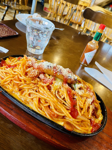 Read moreログハウスカフェの「ザ•鉄板イタリアン🍝」 ◆イタリアンスパゲティ🍝¥650 ◆アイスカフェラテ¥500 熱々の鉄板イタリアンは、結構量が山盛り❗️オニオン🧅ピーマン🫑ウインナーのスタイルにもちろん卵が敷かれてる🍳これぞ「ザ•鉄板イタリアン🍝」おいしかった〜😋前日のテレビでナポリタンの特集を見てたので、口ん中ケチャップ🍅になってたからここで食べれてよかった😆 アイスカフェラテも量がたっぷりでうれしい☺️滑らかでクリーミーな泡アワとミルクのコクが深くコーヒーもしっかり効いてるのでおいしかった。 コーヒーのお供がオールドファッションな見た目のしっとりドーナツ🍩これもよかった😊