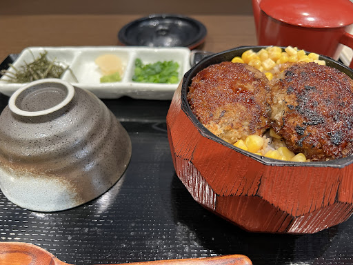 ハンバーグは牛豚の合い挽きで肉汁を 閉じ込める為かパン粉をまぶしてある タイプです。 肉肉しい感じではありません。 箸でハンバーグを割ってみると 肉汁があふれてきました。 照り焼きソースなんですかね 甘めのソースで美味しいです パサパサせずジューシーで ご飯が進みます。 そもそもハンバーグに出汁をかけるのが 美味しいのか疑問でしたがこれは 美味しかったですね。 最初は出汁の味、噛んでいくと肉汁の 味、口の中で上手くまとまります。 もう少し出汁が多めだと嬉しいですね。 ご飯は大盛りでしたがペロリです。 トッピングごコーンなのが色々試した結果 なのか他はなかったのか疑問でしたが 全体的には満足です。 価格も手頃だと思います。 ハンバーグ自体美味しいので 他...