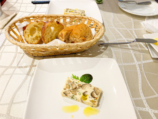 ⚫︎オードブル⚫︎ ・きのこのテリーヌ(?) お魚の練り物のような風味がしたので白身魚のすり身も使われてるのかな?きのこの食感がコリコリとした和風仕立て。オリーブオイルとともに。