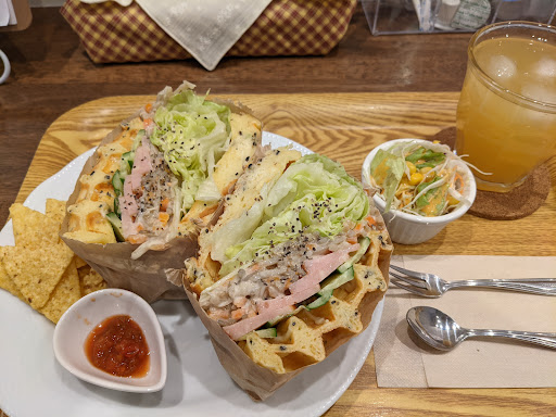 ---2024/6--- 仲間たちとやってきた♡ みんなで黒ごまワッフルサンドのランチを 頼んで、シェアして、ひとり2種類食べられる ようにしたの🤭 ✦根菜チキンサラダ ✦海老アボカド ✦ハムエッグ ※マスタードが薄〜く塗ってあるから 辛いのがからっきしダメな人は注意かも。