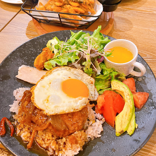 私がオーダーしたのは、 『煮込みハンバーグロコモコ風 (十六穀米、サラダ、デリ、プチスープ付き)』¥1,480(税込)