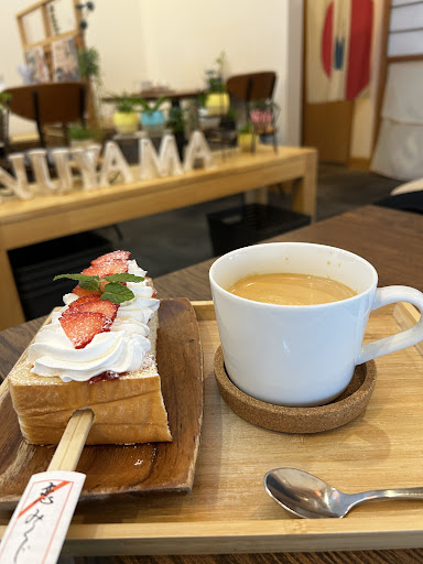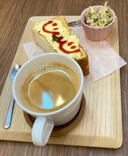 Read moreモーニングに伺いました。白壁に木目調で、オシャレでセンスの良いイイかんじの綺麗な静かなお店です。paypay利用可。 駐車場は店脇(北側/右側)に3台(④⑤⑥)あります。道は一方通行なので北側から進入して店の手前の駐車場の奥に停める感じです。メインストリートから1本西側の道です。南側から進入しようとするとメインストリートの人混みをかき分けてくるっと回ることになりました(すみません)。 モーニングは、ドリンク代だけでトーストとサラダが付きます。+300円のホット・サンドはベーコンエッグを選択するとたまごが分厚い。そのうえに、カリカリの耳を切り分けてホイップクリームを添えてもう一品になってます。絶妙。小生はこれで射抜かれてしまいました。 先に会計して、テーブルに着くシステム。 座席は20席程度。店内は白壁で木目調で綺麗。一方の壁際は畳の長椅子になっており、ちょっと詰めれば、あと2人くらい入れます/入ってました。店内の至る所に犬のぬいぐるみがいます。犬のセンスがいい。狭い店内ですが、天井が高く関節照明が効いて、店内が明るく、センスが良いです。居心地が良く、長居されてる団体がいらっしゃいました。 伺った際は、店員さんは2人で切り盛りされており(店内のイラストからたぶん2人で切り盛りされてると思われます)、ちょっと待たされました。日曜日10時ごろで3組待ち。テーブルは空いているので、テーブルを片付けたその足で、待ってる人を案内して頂ければ回転率も上がるかと。店員さんの忙しさには拍車がかかりますが。食洗機を導入されれば接客に時間を割けるかと思いますが、静かな店内を維持したいのでしょう。