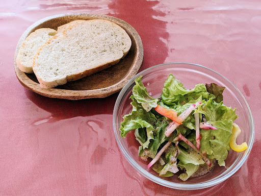 サラダはフレンチドレッシング?が とても美味しい。手作り? パンは犬山茶葉が練り込まれていて😲 フワフワ食感✨