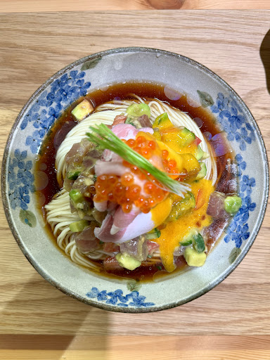 【ビジュアル】 流れるような綺麗な麺線、その上にはマグロやアボカド、レアチャーシュー、イクラ&芽ネギと積み上げられたそのビジュアルはもう芸術的と呼ぶにふさわしい一杯。