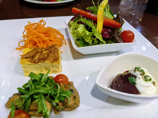 ・前菜盛り合わせ: さつま芋やキノコなど季節を感じる食材を使用してあり、全体の味のバランスを考えて各々しっかり作り込まれています。個人的には理想そのもの!この内容で、このお値段は、かなりリーズナブルで嬉しい限りです!! ・パスタランチ: 鮭とイクラとホウレンソウのガーリックオイルパスタをいただきましたが、素材それぞれの旨味をしっかり感じながらも調和がとれていて大変美味でした! ブルスケッタはザクザク食感の温かいバゲットに、ガーリックの仄かな辛みがアクセント。冷たく瑞々しいトマトのフルーティーな甘みを引き立てています。追加メニューに記載があるのも納得!もっと食べたい人に寄り添ってくださっています。 ランチドリンクメニューから選択。本日は、紅茶のホットにしました。 ・デザート: チョコレートケーキをチョイスしました。程よい甘さで、生チョコのようななめらかな口溶け!温かい紅茶との相性抜群でした。 全てにおいて大変美味しく、是非また来店したいと思います!!!