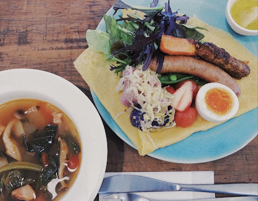 クレープはモッチモチでほどよく甘みのある生地です。 写真の苺の下にあるのが、ミニトマトになりますが これが苺に負けないくらい甘くて絶品でした。 ソーセージも肉感。全部の食材に対して、あー、好き。って終始思いながら食べました。
