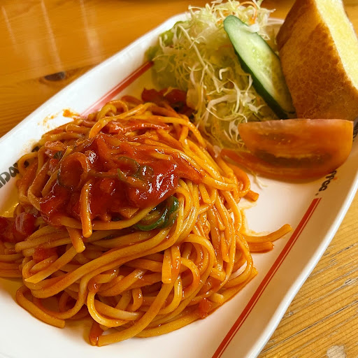 ナポリタンはコシのあるタイプの パスタを使用していて酸味がまろやかな ケチャップと良く絡んで美味しいです! サラダとバケットが付いてます!
