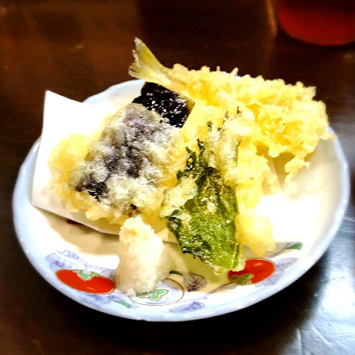 仲々御膳はなかなか豪華(w ご飯と、味噌汁、漬け物にサラダ、刺身5点盛り、焼魚、煮物、茶碗蒸しにデザートのコーヒーゼリー付き。 さらに「天ぷらは揚げたてをお持ちします」とのこと。 刺身は塩カツオ、蒸しだこ、ワラサ、カンパチ、大トロに近いマグロで、どれも新鮮で美味しいです。 途中で運ばれてきた天ぷらはキス、なす、大葉で、揚げたて熱々サクサクでこれも美味しいです。 品数が多くてご飯が足りなくなりそうでしたが調整して食べながら完食。お腹いっぱいです。 ちなみにたくさん食べる人はご飯のおかわり無料とのこと。