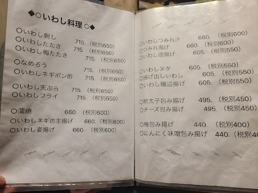 2024.9.15 妻が遊びに来たため2回目の訪問です。 前回と変わって夕方の開店後に来ました。 一応いわしの入荷を確認してからきました。 今回はお酒を呑めるのでいわし三昧です。 いわし刺身、いわしなめろう、いわしフライ、いわし梅たたき、天ぷら盛り合わせ、刺身盛り合わせ、イカ刺身、なす生姜焼きを注文。最後に飲み物で生かぼすサワーおいしかったです。 次から次にお客さんが来てほぼ満席に。 相変わらずここのいわしはおいしいですね。