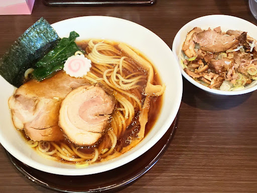 醤油ラーメンは2種類のチャーシュー(大きめと厚め)が入って、見た目にも満足価格。 生姜の香りが鼻から抜ける醤油スープ。 上着を着て食べてたけど、途中で体が暑くて脱ぐほど生姜効果? 中太ストレート麺は食感もあり。