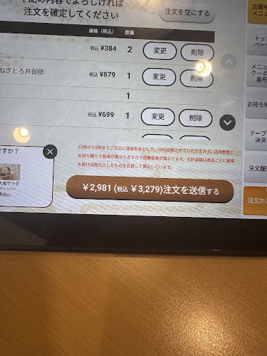事実確認に散々手間取ったあげく、タブレットでの修正・再注文を客にやらせようとする態度はいかがなものか。 呆れて食べた分だけ支払って帰ろうとするも、修正したレシートを発行もせず。(セルフレジなのでレシートがないと精算できない)