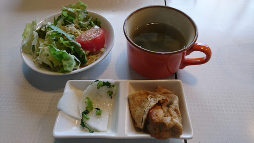 Read moreテラス席だけでなくカフェの中もワンちゃんもOKだし、お料理を作ってくれるお母さんも店員の方も皆感じが良くて落ち着いてゆっくり出来ます。ランチを頼むとご主人が焼いてくれてるみたらし団子がサービスで付きます。お料理はどれも美味しくて日替わりの小皿とスープも付くしボリューム満点!その上ドリンクも付いてなんと...