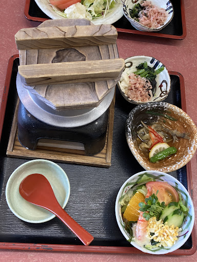【食事】 大人数で予約していたので、宴会会場に入るとすでに料理が並んでいました。 ・会席コース(大人) マグロ・鯛・ホタテの刺身、4種類の小鉢、タコの酢の物。席につくと、ホタテ蒸しに火をつけてくださり、飲み物と温かい素麺、茶碗蒸しが運ばれてきました。 海が近いからか、刺身が新鮮で美味しかったです。茶碗蒸しは中に銀杏やお餅など具材が多く入っていました。 ホタテ蒸しのホタテが大きく、ボリュームがありました。 後にサーモン・ホタテ・マグロ・カッパ巻きの寿司と海老・茄子・カボチャ・さつまいも等の天ぷらが運ばれて来ました。天ぷらは揚げたてで、海老が大きくプリプリとしていました。 食後にはシャーベット、スイカ、ミルクレープのデザートが付きました。