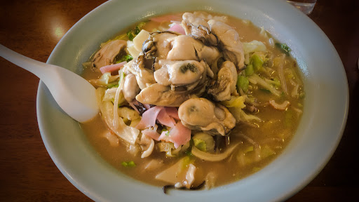 Read more昭和の雰囲気が濃厚に残る香蘭。もちろんお店の電話は懐かしい黒電話、お冷のコップはサッポロビールの広告が入ったグラスです。お店のキャッチコピーは「純中華料理」。その定義はさておき、カツ丼や玉子丼、オムライスも人気メニューのようです。さて、僕は季節メニューの大盛牡蠣ちゃんぽん(1,000円)を注文しました。10分ほど待って出てきたのは、牡蠣小屋が並ぶ通りに相応しい、牡蠣たっぷりの一品。これまた旬の新タケノコも盛りだくさんで、嬉しい限りです。スープもあっさりで、さっぱり。飽...