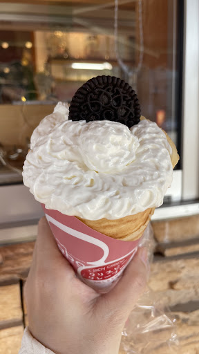 ふつうのクリームと違って泡だててあるような感じで、軽いです。ガワはクリスピーで、クッキーよりかたい。薄いお煎餅くらい。私はもっと柔らかいのが好みですが、美味しかったです。
