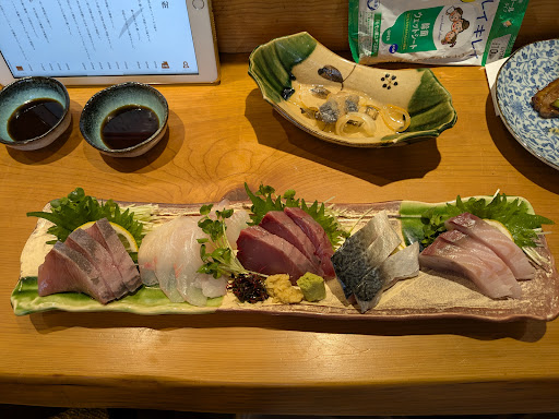 遅くなってすいませんと一言だけ謝罪があり、五種盛りのお造りの魚の種類の説明だけして皿を雑に置いていき、急いで裏の調理場に戻って行きました。