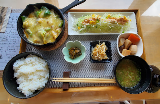 ちょっと重い引戸を開けて店内へ入ると、うん?少し雰囲気が変わったように思います。 川を眺めるように配置されていた席が一部変更されている感じでした。 今回は、3月の月替わり定食(煮込みハンバーグ定食)とパンケーキ(チョコバナナ)とコーヒーをお願いしました。