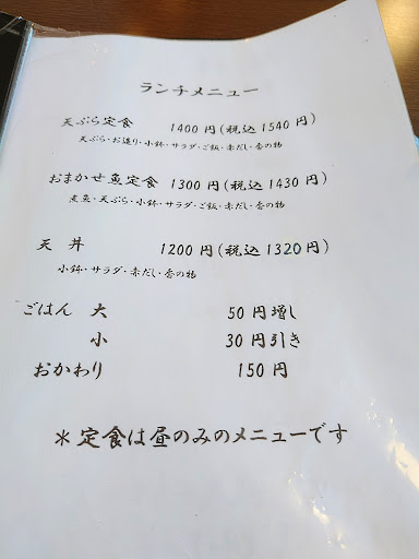 とても清潔感のある畳の和室で頂きました。⤴️11時半、開店前から数組待っておられました。入店すると直ぐ、にこやかなお姉さんや大将の挨拶があり、温かい感じが有ります。天ぷら定食税込み¥1320円にしました。小鉢にお刺身(厚切りで新鮮)、お漬物、鯵フライ、サラダが付き、アオサの味噌汁です。食べていると後から揚げたて熱々の天ぷらが届きます。サクフワっとした食感で、柔らかく、私的には硬くて口内が痛くなるのよりこちらの方が好きです。鱚と鱧?と海老🍤、🍆、南瓜、ピーマン、あと一種付いてどれも厚切りで上手に揚がってます❗食べる人の事を考えた嬉しい品々です❗人気店なのでゆっくりせず食べたら直ぐに退店するのが礼儀かな。一巡で一回満席🈵になりましたが、12時過ぎに退席したので、その頃には、二巡目のお客さんが入れます。🙋帰るときも大きな挨拶があり、また行ってみたいとても良い店です❗😻。場所が分かりにくいですが、とりあえずNI...