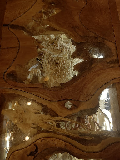 一階のお風呂は浴室に帆船が飾られており湯船は1度に4人が浸かれる程度の板張りのひのき風呂でした。 宿泊している方が多ければ交替制のようです。