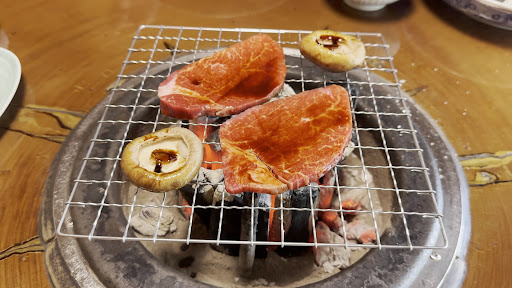 仲居さんがテーブルの焼き台に炭を丁寧に並べて、火が起きたら、目の粗い網を置いてからあみ焼きがスタート。分厚くカットしたヒレ肉を、たまり醤油のタレにくぐらせてから網に置いてじっくり炭火で焼き上げ、ちょうどいい頃合いに仕上がったお肉を一人一人に取り分けてもらえる。