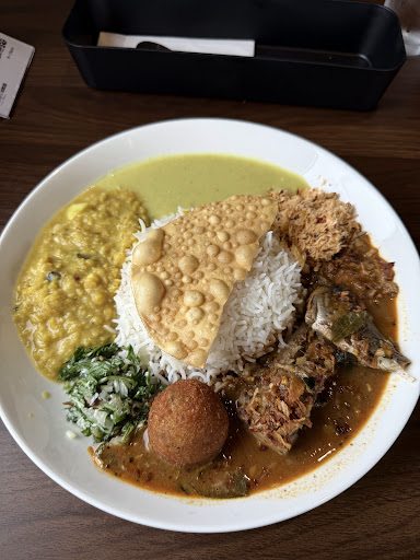 スリランカカレーはスパイス、ハーブが効いたサラサラとしてあっさり 周りにいくつもの副菜(チキンorポーク、鰹節のようなもの、オクラやジャガイモをカレー味にしたもの、コロッケなどなど)少しずつ混ぜて食べるようです。ライスは柔らかいですがパラパラしてカレーと副菜と混ざり合いとても食べやすかったです♪ 軽くスプーンが止まらず早く食べたため満腹感は?ちょっとボリュームが足りなかったような‥