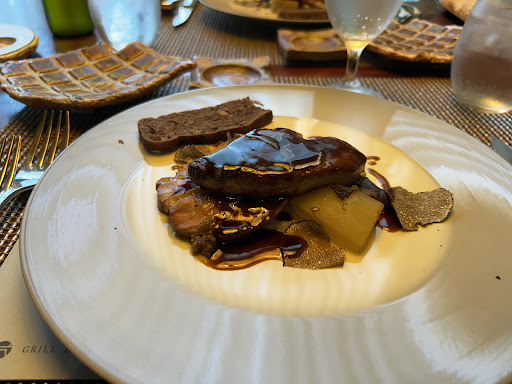 フォア・グラのソテー 冷製魚介オードゥブル スープ(伊勢海老) 黒毛和牛の炭火焼きグレイビーソース デザート、という構成。