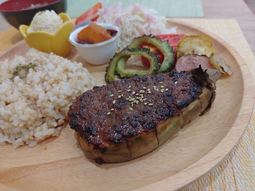 ●茄子の肉みそ乗せ 大きくカットされた存在感のある白茄子はとろっとしていながら適度に食感が残り、神奈川県ブランドのあつぎ豚を使用した甘辛い味付けの肉味噌と一緒に食べればボリューム感もしっかりあってご飯がめちゃくちゃ進む😊そして副菜もまた豪華、ほぼ自社農園の野菜をしようする為日替わりで、この日のサラダは赤、黄、緑色3種類のトマトに赤玉ねぎ、キャベツに粒マスタードがアクセントポテトサラダ、ドレッシングも豆乳マヨネーズまで自家製ってのが凄い!!4種野菜の中華炒めは食感の違う茄子とパプリカ、グリル野菜はゴーヤ、トマト、ビーツと野菜がたっぷり使用されています!!お味噌はこだわりの信州味噌にキャベツとジャガイモが入っていて、ずっと飲んでいたい味わい!!