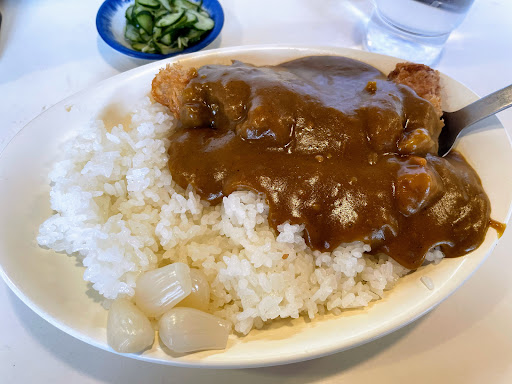 まず、ルーは欧風で野菜を煮込みタイプ。 味はドロ系で、スパイス感あります。 うん。懐かしい味で美味しいですね。 そのルーに対して、白米は甘めに炊き上げです。 ただ、思った以上にルー少なめ…バランス良く食べないとね。 そしてとんかつはきめ細やかな衣で薄切りカット。噛んだ瞬間ジューシーと思います。 白米は甘めで美味しいです。 んんー、ルー、もう少し欲しいー。