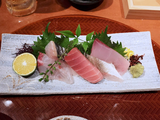 「厳選地魚5切盛」:638円(税込、以下同) 味3.6点/CP4.0点 このお店でカウンター席を利用した時だけオーダーできるメニューがあり、その中の1品です。2人分オーダーしました。 ネタは、いなだ・さわら・鮪・ヘダイ・ブリの5点盛りでした。配膳時に魚の種類をちゃんと説明してくれました。嬉しいサービスです。どのネタも美味しい。特にヘダイが気に入りました。安いからと刺し身が薄切りだったり小さめだったりではありません。これはお得です。