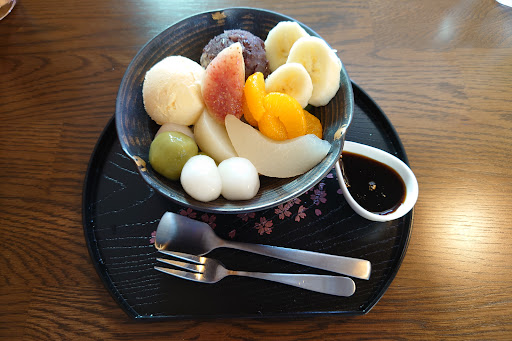白玉クリームあんみつとアイスコーヒーを注文。 白玉はフニフニで柔らかく、あんこと黒蜜は甘過ぎず、凍らせたイチジクの果肉がシャーベットみたいでとても美味しかったです。 アイスコーヒーも苦過ぎないのが良かったです。