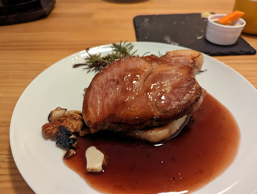 豚肉のコンフィ ガッツリいきたい人にオススメ 豪快な豚の肉塊ですが、じっくりと低温でコンフィされたお肉はビックリするほど柔らかく、噛めば噛むほどジューシーな旨味が溢れます。 濃厚な赤ワインソースとマッシュポテトがよく合いとても美味しいです! 影の名物メニューだったりします! ぜひご賞味あれ!