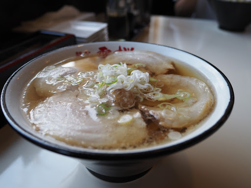 Read more2024年5月下旬、休日ランチタイムに初訪問。国道50号沿い、交差点の近くにあるお店。交通量が多く、スピードが出ている車が多いので出入りはやや気を使う。信号のある交差点が近いからタイミングが合えば右折も無理ではない。 駐車場は店の前に。待機椅子が店内エントランスと外にある。ウェイト・リストもある。 店内はおしゃれな洋楽が流れテーブル席3席とカウンター席が数席。 少し待ってから席へ案内された。どの席も窮屈感はなさそう。少人数で回しているためかやや待ちがあるように感じた。 ラーメンはスープが透き通っていて喉越しもよく美味しい。麺は縮れ麺、スープと絡んで美味しい。餃子は一般的な餃子と比べると大きい。皮はパリっとしてタネはニンニクやニラの風味がしっかりして美味しかった。チャーシューは厚みはないけどしっとり柔らかくてこれも美味しかった。麺の量が多く、夫は大盛りにしなくてよかった、と言っていた。私も麺の量が多く餃子を2個食べるのは無理だった。 とにかく全部美味しかった! 電子マネーの表示がなにもなかったからおそらく現金のみだと思われる。