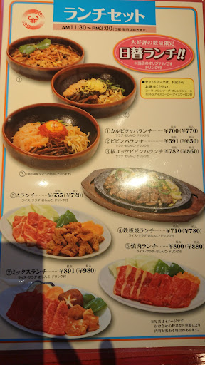 Read more平日ランチ時に初めて利用しました。何年前からあるのか知りませんがかなり古い建物だと思います。前にいた老夫婦には席に案内する際「テーブル席にしますか?」など声がけがあったが、わたし達夫婦にその声がけはなく会計近くの席に「こちらにどうぞ」と案内されました。入るとほりごたつ式?で靴を脱いで足を入れるのですが、足元にもおしぼりの袋のゴミや、紙のゴミが落ちていて、あげく料理を焼く網の上にもストローの袋のゴミが置いてありました。案内した店員が気づき「すみません」と言ってゴミを取り除くだけで網の交換等はなし。座る座布団にも米つぶがつぶれたような物が付着し、汚れているのが一目でわかる。調味料の塩?のようなものも固まっており、爪楊枝入れ周辺も汚い。 ここで飲食店で、チェーン店で、こんなに汚い店なのかと落胆し、それでも料理が美味しいなら我慢しようとしましたが、旦那が焼肉ランチAを注文しようとしたところ品切れで、焼肉ランチ(ほぼホルモンの)が先に到着し、主人が食べ終わる頃にわたしが頼んだ石焼きビビンバがきました。入っている具材もありきたり、味も家で作れるていど、石焼きの器は忘れていたのか熱がすごく取り皿によそう際に米粒が飛んでいました。こんなに熱された石焼きの器は初めてです。主人にわたしの機嫌が悪い事を指摘され、衛生的にわたしは受け付けられない店だと伝え次は絶対利用しない、お金を支払う価値がないと伝えました。でも利用してる人(回転率)いいよね、と言っていましたが、たいして席の清掃もせず安価な値段で営業してるからじゃない?と答え今後は利用しない(伊勢崎西店)と決めました...