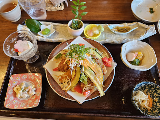 8月連休中の12時半前に連れと、伺わせていただきました。車のナビで近隣まで行き、Googleナビでお店まで行きました。お店には看板などがなく、ほぼ民家のような家屋ですので見つけ難いです。 店内はとても落ち着きがあり、時間がゆっくりと流れている雰囲気でした。 メニューが豊富で迷いに迷いましたが、連れは、9種の緑黄色野菜と鶏唐揚げのサラダ仕立て。私は、プレート御膳ダブルセットで、まぐろのカルパッチョとクリームコロッケを注文させていただきました❗