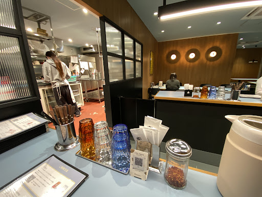 卓上には、刻んだトウガラシ、お箸、スプーン、フォーク、お手ふき、コップ、ピッチャー、呼び鈴、QRコード、メニューが置いてあります。