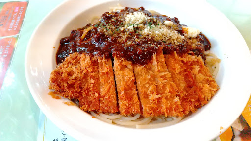 群馬に生まれて長いこと群馬に住んでいたのに、ずっと群馬県では有名だと知らなかったシャンゴ。高崎に住んでいたことのあった主人は知っていて、高崎の方向にドライブで行ったときに立ち寄って、本日は2回目の訪問です。店舗は別の場所です。高崎よりも手前の伊勢崎にあることを知ったので、そちらを選びました。前に行ったのは2年くらい前でしたが、その時主人の食べていたシャンゴ風パスタを味見して、不思議な味でびっくりしたのを覚えています。 今回は見ている大食いyoutuberさんが最近動画あげられていてまた食べたくなったので、私はシャンゴ風パスタにしました。主人はシスポーザという、トマトソースに恐らくシャンゴ風パスタのミートソースがかかってるぽいものを選びました。きっとお腹きつくなるだろうとセットにはしないで単品の注文です。麺の種類が3種類あって、ジャンゴ風パスタは高崎スパゲッティーというもちもちとしてボリュームのある麺で、Sでも他が150gなのに250gあります。ミートソースは昔食べた味となんだか違ってました。前に行ったときのは焦がした苦みっぽいのが強かったきがします。今日は濃厚で甘みのあるソースで麺にしっかり絡んで美味しかったです。ずっと同じ味をたくさん食べられない私ですが、とんかつと共に食べていたら、最後まで飽きずに食べられました!主人に手伝ってもらいましたが、それでも今日は一人でちゃんと食べてたと思います。この味はこのお店に来ないと食べれませんね。美味しかったのでまた食べに行きたいです。