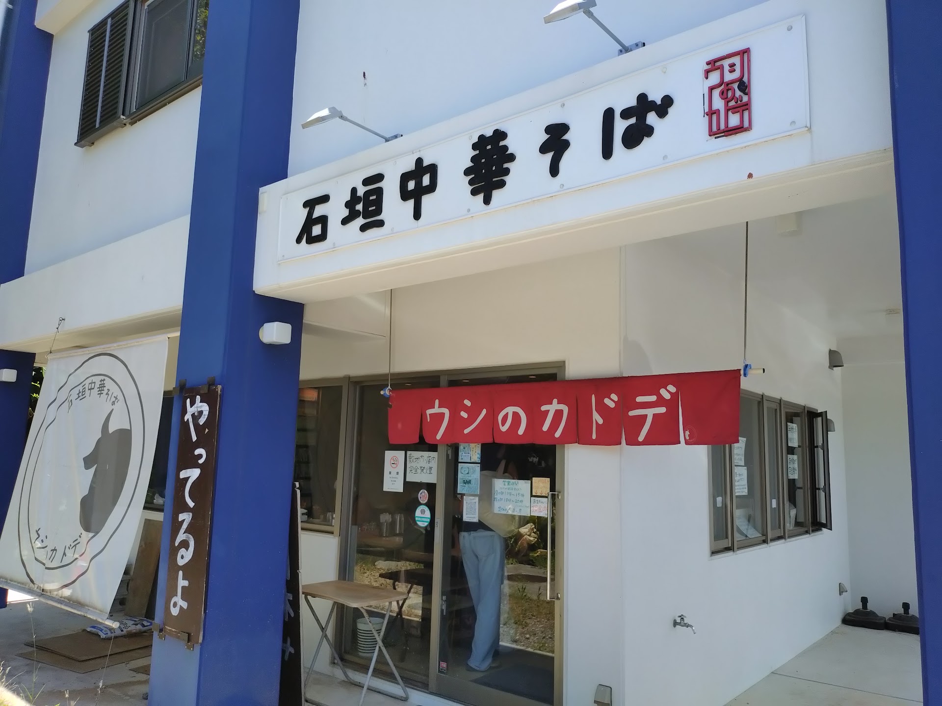 白に青の映える綺麗な外観赤の暖簾とウシのデザインがすごく可愛い。