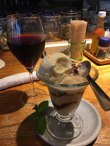 We popped in on afternoon souvenir shopping spree to get Heavy Drunker on dessert and treats. The kind clerk sat us at the bar. And we ordered Aka glass wine and malts. The whisky and rum line up is top notch. Macallan 12 sherry cask and Springbank 10 are there. Ardbeg Ten as well- but it isn’t in the menu. Look at the shelf for what’s on offer. The bar is really well appointed and the bar itself is beautiful. There is space and you can really relax there. The aged Awamori on offer is nice too- I tried a 6yr aged and if you are new to this drink, and have been trying unaged, I urge you to try the aged spirit, much smoother and subtle flavours, it will grow on you and hair will grow on your chest , be careful. The afogato and peanut pudding elevate the humble peanut and coffee bean with Blue Seal sugar cane ice cream. The former was an excellent partner to the Macallan’s...