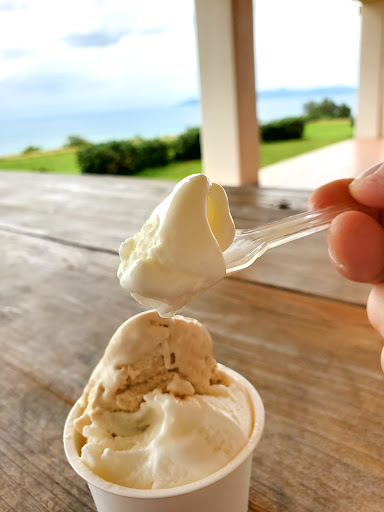 Read more今回、知り合いの鶏舎に行く約束とInstagramで知り合った島のジェラート屋さん 【ミルミル本舗】 の方に御挨拶をとフサキ方面へ向かいました。 色々あって紆余曲折やっと徒歩で到着も鶏舎が見つからず連絡もつかず断念⤵️⤵️ ならばとミルミルさんへ向かいました。 なれど知り合いはおらず今日は空港店勤務⤵️⤵️ あたしゃいったい何をしに行ったのか🤣🤣🤣🤣🤣🤣 気を取り直してミルミルさんを見て周りました。 高い場所にあるので景色は綺麗だろうと漠然と思っていましたが、綺麗どころか凄い絶景‼️ 空気が澄んだ晴れの日はジェラートの味を感じないくらい景色に見とれるであろうパノラマでした。 お土産屋さんは地元の作家さんの物が陳列され、ミルミルさんのオリジナルジャム等が並べられています。 調理に携わる私が1番引かれたのは冷凍の牛肉😆 時にスジ肉が1kg800円と思わず購入しようか悩んでしまいました😆 さて、ジェラートを頂こうと売店へ。 接客をして頂いたのが、恐らく中国からの若い元気な女性。 『貴女が勧める食べてほしいジェラートはなんですか❓️』 と聞くと、とにかく嬉しそうに明るい声で 『ミルクと黒糖です‼️』 と即答😆 その屈託の無い明るさに気圧されて 『ではそれを下さい』とお願いしました。 頂いた感想は 石垣島の輝く季節、太陽が燦々と照る夏に頂く事を考えて作られたような感じを受けました。 恐らく高温殺菌して軽く仕上げさらっと口どけの良いジェラートを目指したのだと思います。 黒糖もミネラルが強く味が濃いことから、重たくならない配合比率を試行錯誤して黒糖らしさも引き出す仕上がりになっていました。 私が感じたことは、難しいのは重々承知で、冬場に向けたジェラートもあっても良いのではと感じます。 低温殺菌で乳脂肪分を上げて牧場併設ならではの濃厚なジェラートがあれば寒い時期でも需要はあると思うのです。 仕込みも大変ですし価格も上がりますが、牧場の牛を見せながらの【牧場濃厚仕立て】とプレミアム感を出せば喜ぶ御客様が多くいらっゃると勝手に思いました。 生意気を言いまして申し訳ございません🙇♀️