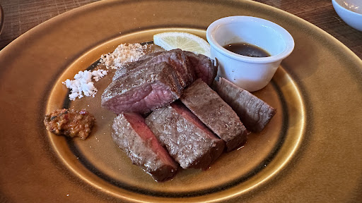 ・JA公認A4等級石垣牛の溶岩石ステーキ お目当てのメニュー! 塩2種類と島七味とレモン、ステーキソースが 付け合わせでついてきました! お肉だけでも美味しいので塩がおすすめ! 沖縄ってホントに塩がうまい!!!
