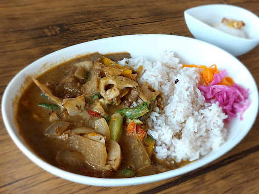Beautiful cafe located in a beautiful place. Very clean and nice decorated. A modern okinawan atmosphere. Looking to their sales corner, seems they care about organic food. Service is very good, staff polite. I ordered a vegan curry, it was kindly prepared and well served with a local made tofu. Tofu was excellent. Curry tasted very natural, overall good but a bit bland. Probably is their food philosophy I may guess. Anyway ingredients were natural and fresh. Outside sea view terrace is also very beautiful and pleasing. If nice weather suggest you to...