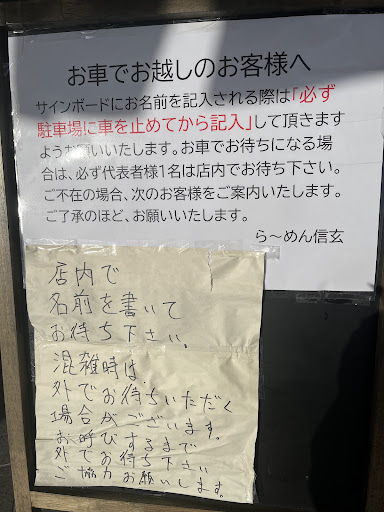 Read more1時間待ち。新店舗は店舗の自動ドアを通るとすぐ右手にEーPARK順番受付・発券機がある。これは注文する機械ではない。注文は、店内の長椅子で待ってる間に店員さんがメニューを持ってくる。そこで伝える。 開店前に並ぶとなると、11:00までは電話かLINEで呼び出し発券機を使わず、普通に外で立って並ぶことになる。11:00後に最初の自動ドアを通る人は発券機で手続きして、あとは電話かLINEでとなる。 リニューアル後に行くのは初めてだったが、前の店舗より清潔感と広さがあって良い。 行ったのは5/11日曜日。10:40。開店20分前。小雨。駐車場アスファルトの所の車は埋まり、舗装されてない所は十分に空いていた。時間に余裕を持って並んでいる人が多いようだ。 カウンターは14席。 小上がりは6人ブース×3つ テーブル(イス席)は6人ブース×2つ。 相席は無いので、6人席でも2人で座る事が可能だ。 10:40時点で待ち人数35人程度。 10:50での待ち人数は10:40時点+9人。 10:55での待ち人数は10:50時点+6人。 11:00での待ち人数は10:55時点+5人。 なので、11:00開店時点では55人程度が待っていたことになる。駐車場は11:00時点で未舗装部分も含めてあと数台しか停めれない状況だった。で、開店して35番目程度の私は、あと10人くらいの所で座れなかった。 11:00過ぎてたのでEーPARK順番受付・発券機を操作。 年配の人がタッチパネル眼鏡かけないと小さい文字で辛いと話していた。タッチパネル心配な方は店員さんにお願いすれば、やってくれるだろう。 店内にも15人程座って待てる長椅子がある。 11:27店内で待って27分。1番目と2番目に待ってた組のお客さんが呼ばれた。最初に店舗に入れた人の誰がが食べ終わったのだろう。 店舗で長椅子ではなくいきなり着席できるかどうかが待ち時間のカギかもしれない。 私は5番目の組で、席に付けたのは11:33だった。着席まで待ったのは53分。それから着丼までは5分。待ち時間計58分。10:40に並び始めたので、時間さえ許せば昼ご飯時にちょうど良いか。車で待つにしろ、店内で待つにしろ、暇つぶしの道具は必要だと感じた。