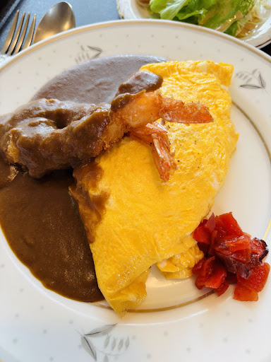 らランチで伺いました 喫煙可能なのでカウンターは愛煙家、 嫌煙家は離れた席になってました。 この日の日替わりは オムカレーの海老フライのせ(1200円)サラダとコーヒーがついてます。 サラダは小さな柑橘🍊がついていました。 他の方も書いていますが、ボリュームは多くありません。 でもホテルの洋食メニューの様な懐かしさが有ります。 オムカレーも何処となく懐かしく 海老フライがゴージャス感を高めてます。海老フライとカレーの相性も抜群ですね。 カレーも奥にピリっとした辛さが有り 美味しいですね。 メニューが全体的に価格改定されてました。 お店の雰囲気もよく、落ち着いてゆっくりと食事...